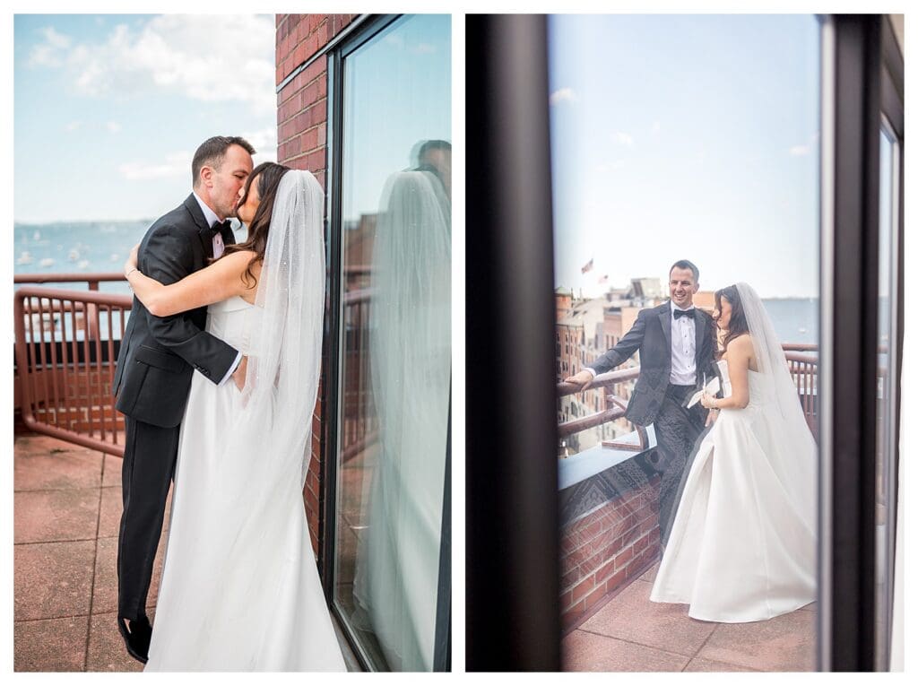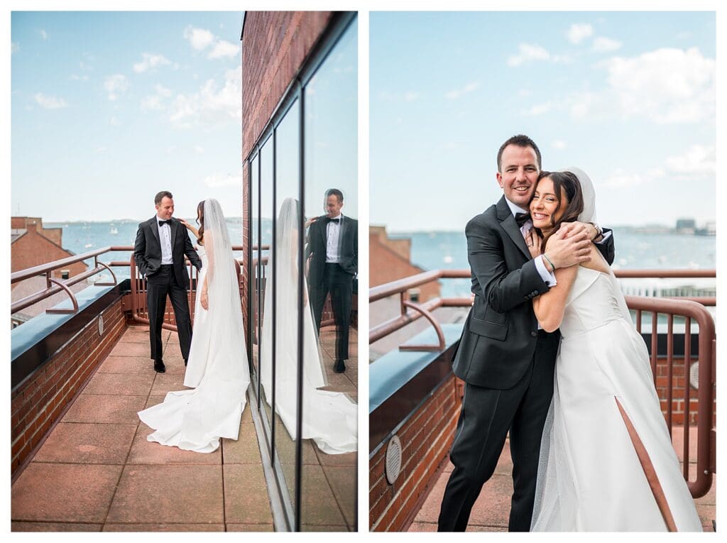 Nicole and Alec chose to do a first look before the ceremony. They met on the balcony. Harbor in the background. Just the two of them.